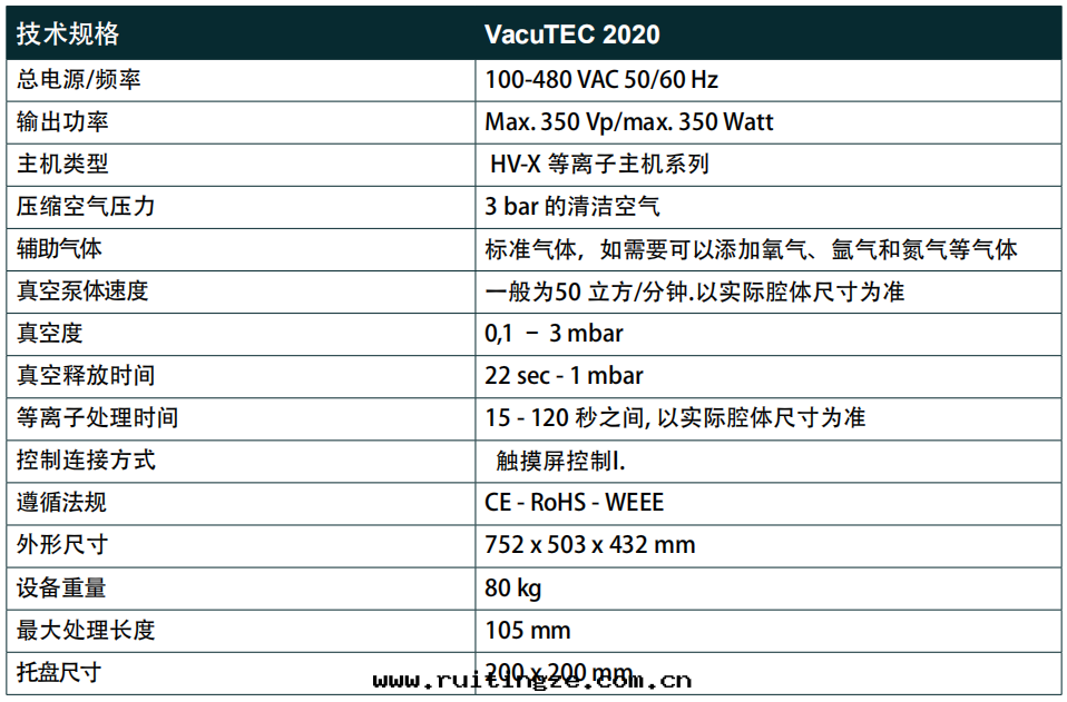 VacuTEC2020真(zhēn)空(kōng)等離子處(chù)理(lǐ)設備具有(yǒu)操作(zuò)简單、生(shēng)産加工速度快(kuài)等優點(diǎn)。處(chù)理(lǐ)过(guò)程中(zhōng)可(kě)以(yǐ)加入(rù)像氩和(hé)氧气(qì)等輔助气(qì)體(tǐ)来(lái)提(tí)升(shēng)表(biǎo)面(miàn)處(chù)理(lǐ)效果(guǒ),但在(zài)大(dà)多(duō)數情(qíng)況下(xià),因(yīn)为(wèi)高(gāo)功率的(de)等離子體(tǐ)放(fàng)電(diàn)一(yī)般不(bù)需要(yào)气(qì)體(tǐ)来(lái)輔助參與(yǔ)。